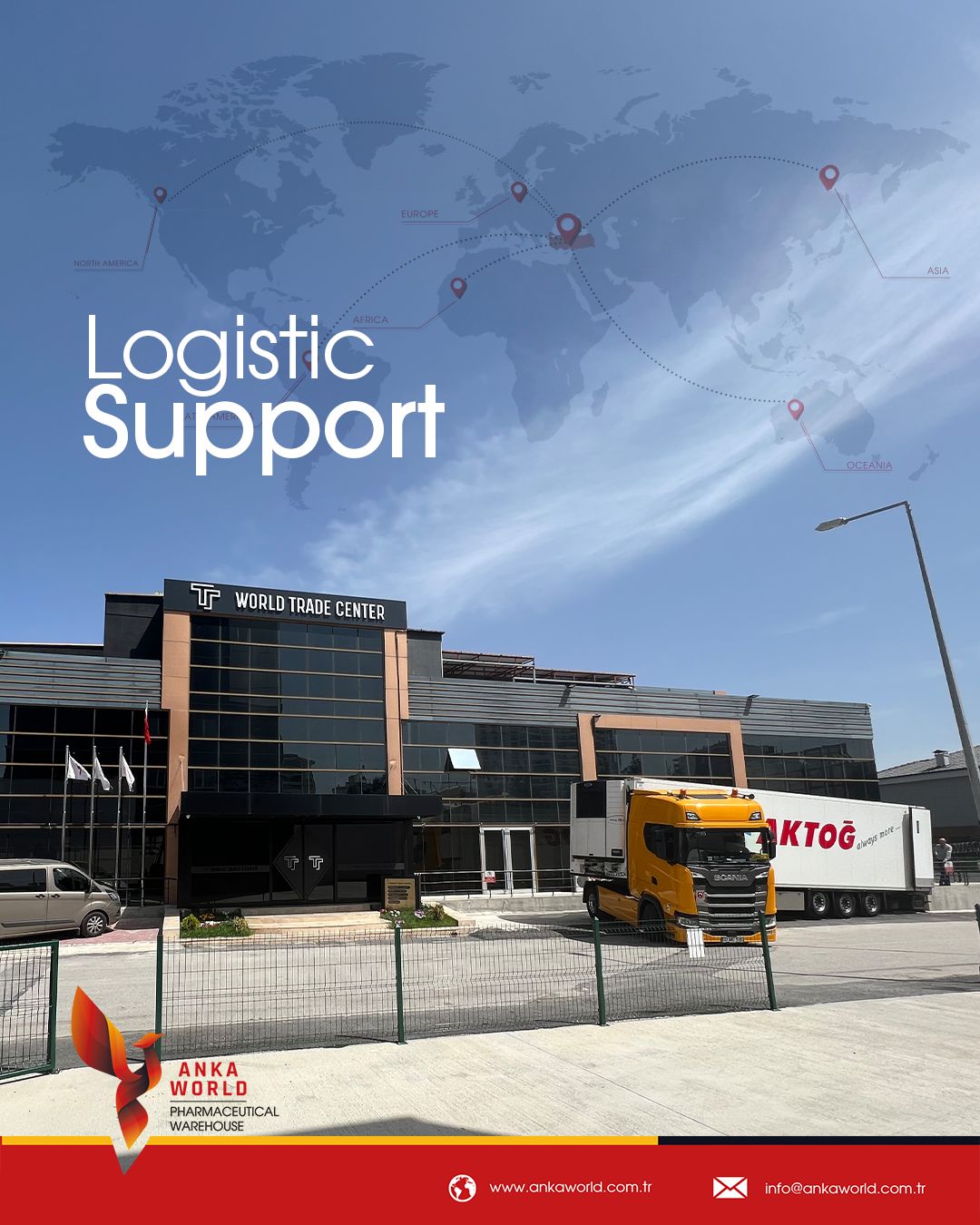 AnkaWorld, Türkiye merkezli olarak Avrupa, Asya, Afrika ve Amerika dahil 70’ten fazla ülkeye aktif lojistik ve dağıtım hizmeti sunmaktadır.
